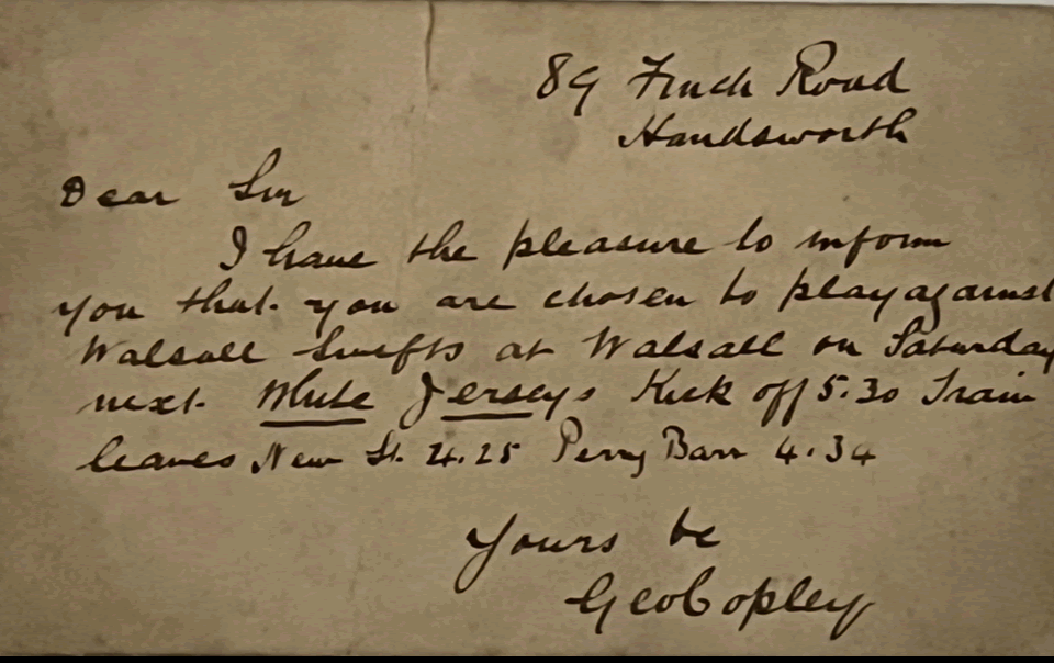 Back in the days before the telephone was commonplace, club secretaries would send out notes to those players who had been selected with brief match details and (if the game was to be played away) travel arrangements. This example, submitted by Jon Farrelly, was hand written by Aston Villa Match Secretary, George Copley in 1881 informing a player (addressed only as "Sir", that he had been selected to play against Walsall Town Swifts the following