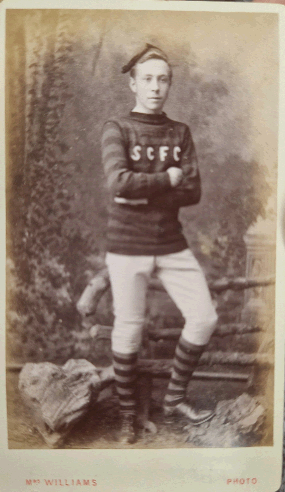 This marvelous photograph was sent to me recently by Caytlann who is trying to find out what team this strapping young chap played for. The headgear, jersey, knickerbockers and hose are all typical of the 1870s and the photograph was taken in the studio of Sarah Williams in Wolverhampton so the team are most likely from the Black Country. I have no record of any team with the initials SCFC in the Midlands from this period (and no it's not Stoke City who were known simply as Stoke FC at the time). If you think you recognise the team please let me know.