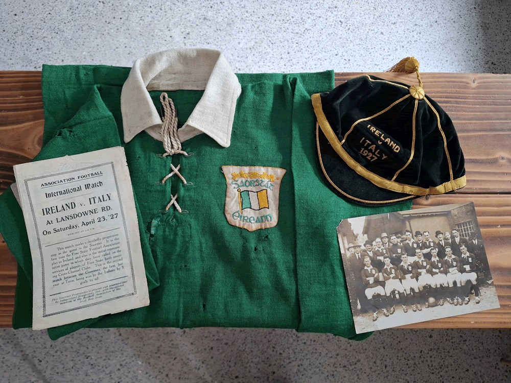 This photograph was sent in by Jonny (jcd from NIFG) and shows various memorabilia from the match between the Irish Free State (Saorstat Eireann) and Italy in April 1927. The picture affords us with the first sight of the crest worn during this period.
