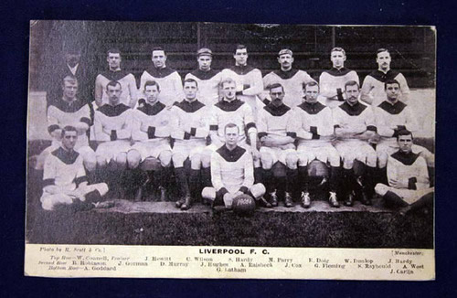 entry). This, it turns out is incorrect. Research published by Jeff Gaydish proves that between 1911 and 1918 the regular pre-season trial matches were recorded as "Reds v Stripes," implying that striped shirts may have been Liverpool's alternative during this period. Stripes were certainly worn in two Football League matches, at Arsenal in September 1911 (left) and at Aston Villa in 1919. (Jeff has identified the photograph on the right as the team that played Villa and not South Shields as I had previously thought.)