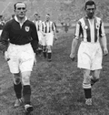 Barry Weekley was in touch a little while ago questioning whether my graphic for Arsenal's kit in the 1930 FA Cup final was correct. He argued that the team wore red socks rather than black. His point is well illustrated by this photograph of the captains leading the teams out at Wembley. This prompted me to examine the photographic record and I found that Arsenal switched from black to red socks at the beginning of the 1929-30 season and retained these until March 1933 when the famous red shirts with white sleeves were introduced. This set, of course, featured navy and white socks.