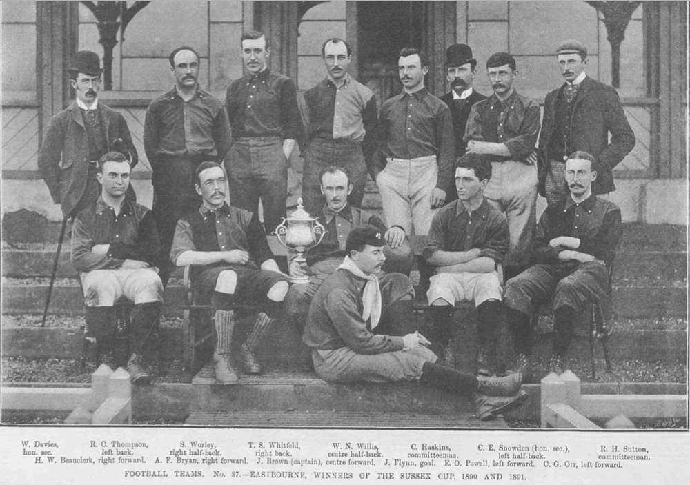 The team on the right is Eastbourne FC pictured in February 1892, offering us an object lesson in how deceptive images taken with the orthographic film plates commonly in use at the time can be. To the modern eye, the halved shirts could be made up of red, blue or green panels on the (player's) left combined with black or dark blue on the right. In fact the team played in yellow and dark blue and do so, as Eastbourne Town, to this day.