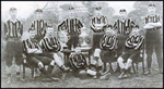 played in March 1893 and once again quarters are in evidence. This prompted me to look again at my photograph archive where I found this 1893-94 group showing the team posing with the committee and some impressive trophies. At first glance the players are wearing two different shirt styles, but when I examined it more closely I noticed two players are in quartered tops. (Click the thumbnail to view a larger image.)