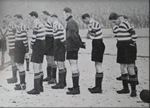 On the left is the unfortunate Stenhousemuir goalkeeper, "supported" by one of his defenders, failng to stop a corner flying directly into his goal in high winds. The action is from a Scottish Victory Cup match against Rangers in April 1946 ('Gers won 8-2 on aggregate). Stenhousemuir had been inactive during the war but did participate in the Scottish Southern League B Division in 1945-46. It is not clear why they are wearing hooped jerseys in this game as there was no reason for them to change their normal maroon tops but it is possible that as clothing was rationed, they could not get hold of these and wore hoops as a temporary alternative.