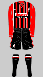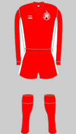 In the 1974-75 season the club wore a rather swish new badge on their striking red shirts, which had a bold white/black/white vertical stripe on the left, a detail repeated on