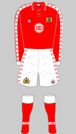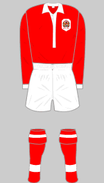 The city crest appeared once again in the 1969-70 season, now embroidered directly onto the shirts, and was used until 1976. Pre-season photos for 1971-72 show the all-red shirts and socks worn with white shorts but this strip was never worn: the photographs were taken before the new kit with white trimmings and shorts was delivered.