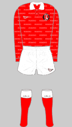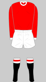 the traditional plain red shirt format. The familiar hand and sword badge was designed in 1963 and first appeared on this smart white strip. The image evokes the club's nickname at the time, "The Valiants."