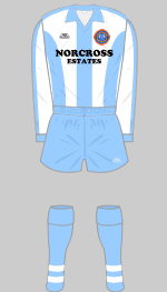 crest was adopted in 1982 along with plain blue shirts (with the obligatory pinstripes of the period). Sky blue and white stripes appeared in 1985 and the crest was updated all to no avail.