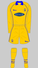 This season's home kit, designed by Precision Training for Notts County, is very similar to last year's but has narrower stripes and solid black shoulder panel. The amber trim, which has been a feature of Maggies' kits on and off since 1989 recalls the club's original colours.