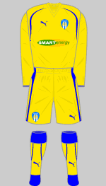 Colchester's new kit closely resembles the one they wore in 1992-93: traditional stripes combined with white sleeves and blue shorts. The reverse of the shirt body is predominantly white. Many Puma kits feature metallic gold trim this season and this one is no exception.
