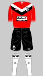 Hartlepool's new home strip is practically unchanged from that worn for the past two seasons. The stripes are reversed and are in Nike's new jagged template and there is contrasting trim on shorts and socks but otherwise it is pretty much the same. The dark red away strip is new. The orange third strip (basically last season's away) was worn for no apparent reason, at Notts County in October.
