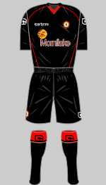 Hereford have replaced the bright orange away strip worn last season with an all-black affair with narrow red hoops on the shirt, mirroring the home shirt, which is unchanged. Black shorts are worn with both sets but white ones are available when needed.