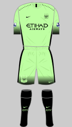 Runners up last season, City have reverted to white shorts with some minimal trim. The collar has very small flaps so it might be mistaken for a plain crew neck from a distance. "Very smart" is my verdict. The sleeves of the change shirt have a print of the Moon's surface sublimated into the fabric, inspired by the supporters' anthem, "Blue Moon." The strip is in "dark obsidian" and "chlorine blue." Note to designers: chlorine is a poisonous yellow/green gas. Think again please. The third strip is based on a template also worn by Barcelona and Inter Milan but in "Ghost Green."