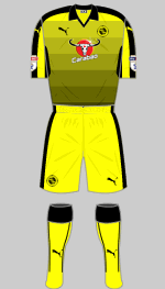 The popular yellow change strip worn last season is retained as third choice and a blue change strip is introduced. The club have signed a three-year sponsorship deal with an online gambling company. The new first kit has fine piping in blue and yellow on the shirts and shorts.
