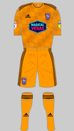 Ipswich find themselves in the third tier for the first time since 1957-58. The red trim has been banished and we have a back-to-basics home strip enlivened by sublimated chevrons. The second strip harks back to 2016-17 which is fine but it's in the new Adidas Stripes template, which is not. The orange strip is held over from last season.