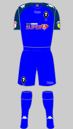 Fifty years ago Colchester dropped their traditional stripes in favour of an all-blue strip worn with white socks closely modelled on what Chelsea had worn a few years earlier. The revival is is spoilt by fussy white detailing and not a patch on the original. As Colchester is a garrison town I suppose wearing camouflage patterns is understandable but the new change kit is definitely spoilt by the blue detailing.