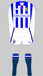 In 1969-70 the traditional shirts were restored and the club adopted the official nickname of "The Terriers" with a suitable badge to match. At the end of the season Town returned briefly to Division One. There followed a catastrophic decline and in 1975, they were in the Fourth Division. Scot Johnston returned to the club and reintroduced the plain blue shirts with monogram associated with his previous spell at the club.