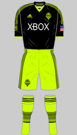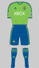 Seattle topped the Western Conference and won the Suppporters' Shield for finishing the regular season with the best overall record. They also won the US Open Cup into the bargain. They have introduced two new kits although the first choice kit is not very different from last year's. Last season's unpleasant third strip was worn in the US Open Cup against Portland when their change kit would have been perfectly adequate. This outfit was worn with an updated sponsor's logo against LA Galaxy.