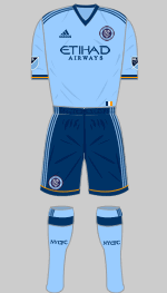 The New York teams dominated the Eastern Conference, NY City finishing second behind the Red Bulls. They lost heavily to Toronto in the conference semi-finals. The dramatic change strip is retained. By adopting navy shorts for the first kit, NYC no longer look like clones of Manchester City.