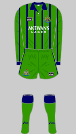 In 1974 Newcastle, along with many other clubs, adopted a replica of the Brazilian national team's famous gold, green and light blue kit, worn inexplicably with orange stockings during 1975-76. The theme was simplified to yellow and green in 1976, with blue replacing the green trim in 1980. Between 1983 and 1988 the team turned out in fashionable silver grey, following which green and yellow made its return.