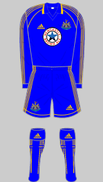 The 1997-98 offering was one of the most interesting designs, consisting of dark blue and olive green with orange trimmings. The 1999 all-white kit featured panels in "teal", one of many novel colours introduced around this time, and was used just once. 2001 brought a blue-grey strip with Adidas' trademark triple stripe trim.
