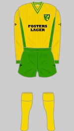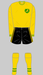 all-yellow shirts with green trim. The canary crest was reinstated, now embroidered onto a rounded shield. The quality of the embroidery was variable and the edges of the shield often frayed badly. Another feature of this strip was the distinctive double stripe on the shorts, a detail that remained