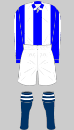 After only three seasons, the Latics won promotion to Division One and in the final season before the League was suspended, they finished as runners-up in 1915, only one point behind Everton. When competition resumed after the First World War, Oldham’s pre-war team was gone and, after four seasons of struggle, they were relegated to Division Two. In 1935, now wearing the distinctive broad blue and white striped shirts that would become their signature kit, Oldham sank into Division Three (North).