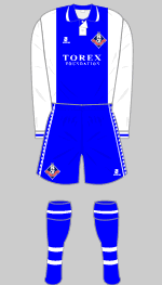 Unsurprisigly supporters preferred the old owl-and-football badge and opted for a graded blue shirt with tangerine accents. The change shirt was modelled on the red and white striped tops of the original Pine Villa club.
