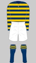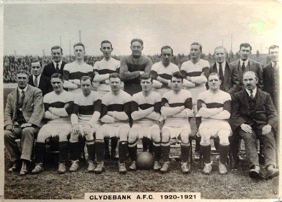 The third Clydebank club was admitted to the Second Division of the Scottish League before a ball had been kicked, a remarkable event by any standards. The Division had been expanded from 12 to 14 clubs and, with the threat of war looming, the shipyards of Clydebank were booming. They played their first fixture on 15 August (a 3-1 victory over East Stirlingshire) just after war was declared. After a single season (they finished fifth), the Second Division was suspended and Clydebank joined the Western League. In 1917 Aberdeen, Dundee and Raith Rovers dropped out of the First Division (which continued throughout the war) due to travel restrictions. Clydebank were invited to fill one of the vacancies. At this stage they adopted a distinctive white shirt with a broad red band, similar to the shirts worn by the first Clydebank in 1888. (Gold and blue seems to have been retained as a change kit - see photograph.) In 1920 they finished in fifth place, their highest ever position.