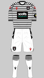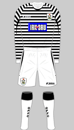 In preparation for their 150th anniversary, the club adopted a modern version of their original navy tops with grey shorts. The white trim on the right sleeve represents the ribbon worn in the very earliest days to distinguish one team from another. It was planned that this revived outfit would be worn for two seasons. The season did not end well and they were relegated after losing out in the end of season play-offs.