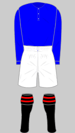 The use of the term "royal blue" here is significant. The "Light Blues" nickname and the paleness of their shirts in photographs suggest a lighter shade was worn but I now believe this is due to the common use of film stock that was less sensitive to light at the blue end of the spectrum, so that their royal blue tops appear pale due to underexposure.