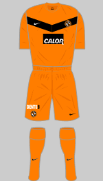 The chevron template Nike made for Manchester United a couple of seasons ago makes a reappearance in a no-doubt conscious effort to combine old and modern: chevrons were worn by the club back in the Twenties. We're pleased to see that the sponsor's logo now appears in black and white rather than the clashing pinky-red of last season. The decision to wear orange shorts with black shirts for the away kit was apparently based on the suggestion of some supporters, which just goes to show that consulting fans doesn't always work out. The shorts were swapped over in mid-September,a distinct improvement.