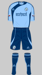 Only four years ago Queen of the South were in the second tier and were narrowly beaten by Rangers in the Scottish Cup final. Times have changed and they now find themselves in the Second Division. The new all-blue look, (a style previously worn in 1999-2000) may be intended to improve their image and fortunes. The official supporters' travel club won the shirt sponsorship lottery.