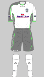 Stranraer were moved from the Third to Second Division because of the reshuffle in the SFL. The black shorts worn with the home strip are unprecedented and give the team an unfamiliar look. The design is the same as the attractive "Toronto" template used for the away kit that was introduced last season.