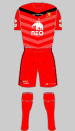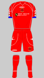 In their first season as members of the WPL, Llandudno qualified for the Europa League where they were drawn against IFK Göteborg. The Swedish side were far too strong and beat the Welsh side 7-1 on aggregate. The striped first kit is more or less unchanged aside from the shorts and sponsor. The red alternative has been updated to the new Adidas design. Both were used in the Europa League but with a different sponsor.