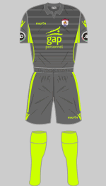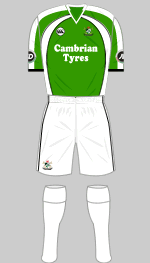 The Black & Greens have retained their first choice kit and now have an equally striking change strip in the same template. It seems match officials decided neither sets would be suitable for the evening match at Cefn Druids so a set of green shirts with white trimmings were hastily assembled. These appear to have been made by Canterbury and lacked numbers or players' names on the back.