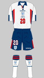 Red returned to the England pallette after the experiments of the previous kits. The new white "home" kit made its debut at Wembley in a World Cup qualifier against Italy and featured bold red and navy side panels. The crest had been redesigned, the three lions now appearing in light blue and a miniature flag of St George was added to the collar. Critics pointed to the large "Umbro" logo that was printed prominently above the crest, overshadowing the more discrete "England", printed below. A red and white change kit was reintroduced, to the delight of supporters, although this version incorporated shadow stripes and a repeat pattern made up of the flag of St George woven into the fabric. The white and navy kit was used 22 times and only one variation ever appeared, when it was teamed with the white shorts of the change kit for the 1998 World Cup match with Argentina. The World Cup versions had "FIFA WORLD CUP FRANCE 1998" printed below the crest. Squad numbers were worn on the shirts as well as shorts in all matches for the first time.