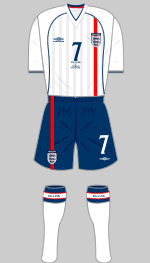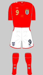 The new red change kit cleverly incorporated the flag of St George as a repeated motif, trimming the shorts, collar reverse, cuffs and stocking turnover. This outfit was used for the first time against Italy at Elland Road on 27 March 2002 and appeared six times, twice in World Cup final matches in Japan (against Argentina and Nigeria). The last time it was seen was in the embarrasing home defeat at the hands of Australia in February 2003. The white shirt had been retired the previous October after the European qualifier against FYR Macedonia.