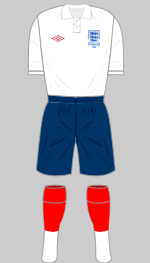 Umbro's new white and navy effort, which was worn for the first time in Budapest on 28 April 1999, was an altogether less cluttered design than worn previously. The crest was redesigned yet again, and now incorporated the word "ENGLAND" on a navy bar above the three lions (now restored to navy blue).