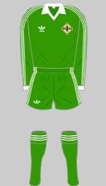 The Irish FA turned to the giant German company to provide their kits from September 1977. The designs were conservative, simply standard templates of the period in traditional green and white, although the addition of green shorts to the change kit provided a welcome contrast (and offered the flexibility of mixing and matching separate elements). The collars had green V necks until October 1979 when white versions appeared for the first time in the game against England. These were worn through to the conclusion of the British Championship in May 1980.