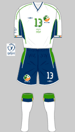 After playing in green stockings for the first few matches in their new home kit, Ireland switched to unfamiliar white. Umbro's design used minimal trim although the tricolour is woven into the collar as a detail. Match details were now embroidered above the FAI crest rather than on the body and the repositioning of Umbro's logo allowed squad numbers to be located on the right breast. The previous change kit was retained until the end of 2007 and then replaced by a standard issue template in the usual white and green with orange and green trim.