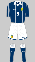 After an association with Umbro that stretched back almost 50 years, the SFA turned to Fila, an Italian sportswear company, for their next set of kits. Established in 1911, Fila had a long pedigree of producing sports equipment but were relative newcomers in the football kit market, to which they brought a sophisticated approach typical of Italian design. Their understated navy and white kit was complemented by a simplified crest traditional navy stockings with maroon turnovers. This last detail had considerable, if unintended, historical resonance: the most popular club colours in Scotland in the years following the formation of the SFA were navy, white and maroon.