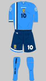 Diadora's 2005 designs were based on standard templates that featured fashionable asymmetric trim. A unique feature was the vertical trim on the right stocking, which must have caused some consternation in the dressing room. The choice of sky blue as a second choice colour seems almost perverse as it could not be used against teams wearing blue shirts, ensuring that the amber third kit got a few outings (as it did when Scotland beat Japan on penalties to win the Kirin Cup on 13 May 2006).