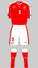 The Swiss are wearing an unremarkable Puma design with two-tone hoops on the first choice shirt. The alternative is much more interesting. Red shorts will be probably needed for both strips particularly if the Swiss progress beyond the group phase.