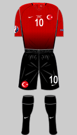 The geometric lines on the shirts are supposed to evoke the complexities of Ottoman architecture. Personally I think the red/black version looks more like a Spiderman costume. The last time Turkey played in the Euro finals they had a turquoise and white change kit. The word turquoise derives the French Turques because this mineral was originally imported into Europe via Turkey.