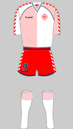 After reaching the semi-finals of the European Championships in 1984, the team dubbed "Danish Dynamite" for their all-out attacking philosophy burst onto the world stage in their first World Cup finals. Their startlingly innovative halved shirts would have been worn with matching shorts but FIFA intervened and insisted on plain shorts for televised matches. West Germany and Uruguay (the South American Champions) were brushed aside and once again Scotland failed to get past the first round.