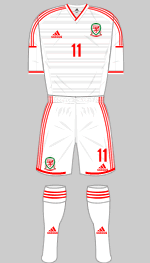A home defeat at the hands of Ireland in their final qualifying game ended Welsh hopes of following up their remarkable campaign in the Euro 2016 finals with an appearance in the World Cup finals. Their new first choice strip, worn for the first time in November 2017 against France, returned to a smart if uninspiring all-red look trimmed in white, worn on this occasion with white socks. (This variant was also worn against Mexico in May 2018.) The change strip revived the white and dark green colours worn five years previously and debuted in the team's fine 6-0 win over China PR in Nanning, which marked Ryan Giggs first match in charge.